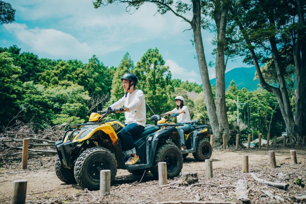 豊かな森の中で、樹上のアスレチック「フォレストアドベンチャー・湯の山」と、森の中を駆け抜ける四輪バギー「カモシカバギー」が楽しめます。