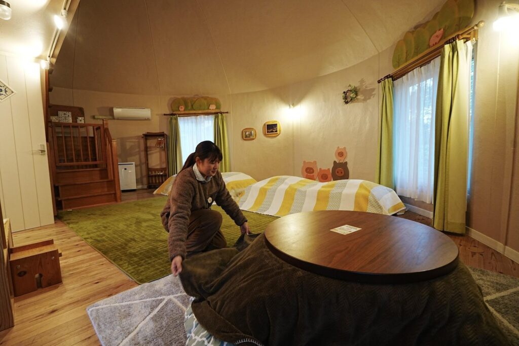 岡野さん:「入社以来、園内にある宿泊施設『OKAERiビレッジ』の運営を中心に担当しています。フロントでのチェックイン・チェックアウト業務をはじめ、客室の清掃チェックや備品の管理など、お客様が心地よく過ごせる空間づくりに幅広く関わっています。