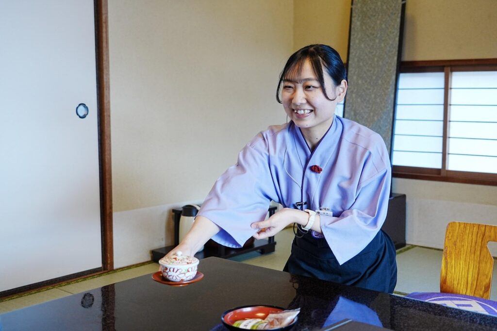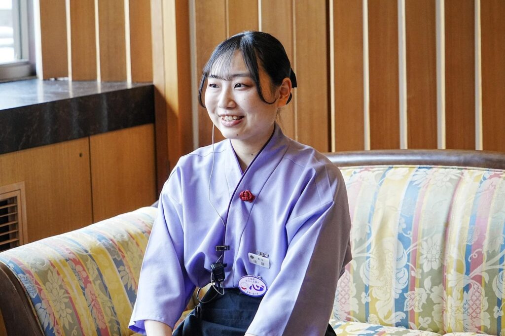 後藤さん:「もともと接客業や旅館業に興味がありました。高校生の時、寿亭で働いている1つ上の先輩や、若い従業員の方がすごく活躍されているのを知って『一緒に働きたい!』と思ったのがきっかけです。職場見学で訪れた際、建物の雰囲気や歴史にも魅力を感じ、ここで働こうと決めました。」